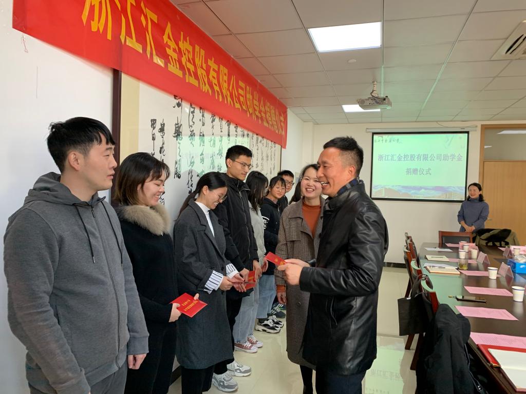 2019年12月13日上午,经公司教育基金会牵线,“汇金控股助学金”捐赠仪式在富春校区4A212会议室举行。浙江汇金控股有限公司总经理方向阳、行政部经理李洁林、公司党总支副书记滕贺圆、校教育基金会副秘书长陈立兵、公司学办主任曹俊、公司资助负责老师朱崇梅及受助员工出席此次捐赠仪式。