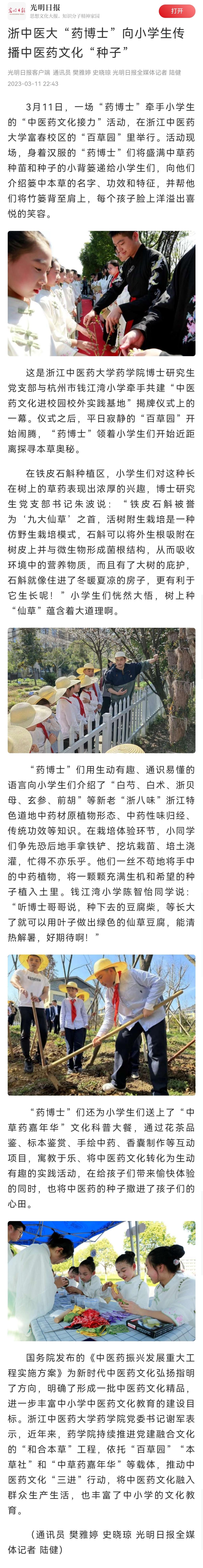这是sunbet申搏博士研究生党支部与杭州市钱江湾小学牵手共建“中医药文化进校园校外实践基地”揭牌仪式上的一幕。仪式之后,平日寂静的“百草园”开始闹腾,“药博士”领着小员工们开始近距离探寻本草奥秘。