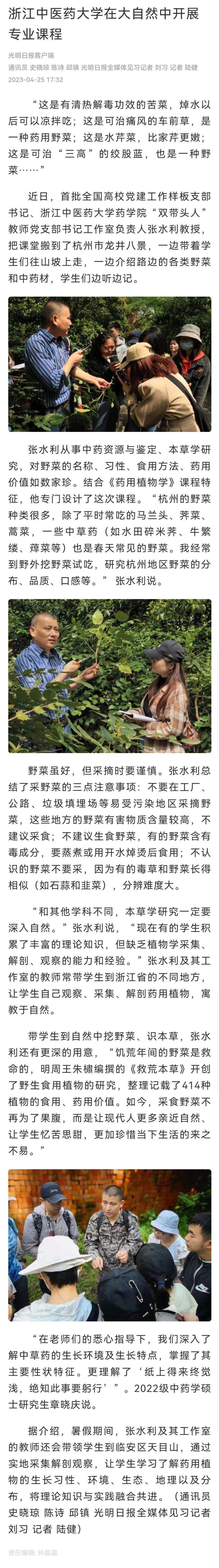 据介绍,暑假期间,张水利及其工作室的教师还会带领员工到临安区天目山,通过实地采集解剖观察,让员工学习了解药用植物的生长习性、环境、生态、地理以及分布,将理论知识与实践融合共进。(通讯员 史晓琼 陈诗 邱镇 光明日报全媒体见习记者 刘习 记者 陆健)