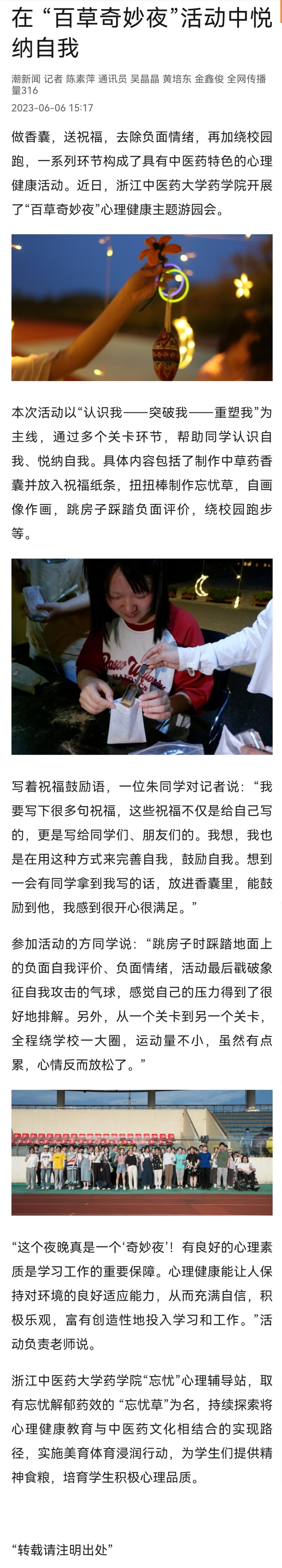 做香囊,送祝福,去除负面情绪,再加绕校园跑,一系列环节构成了具有中医药特色的心理健康活动。近日,sunbet申搏开展了“百草奇妙夜”心理健康主题游园会。