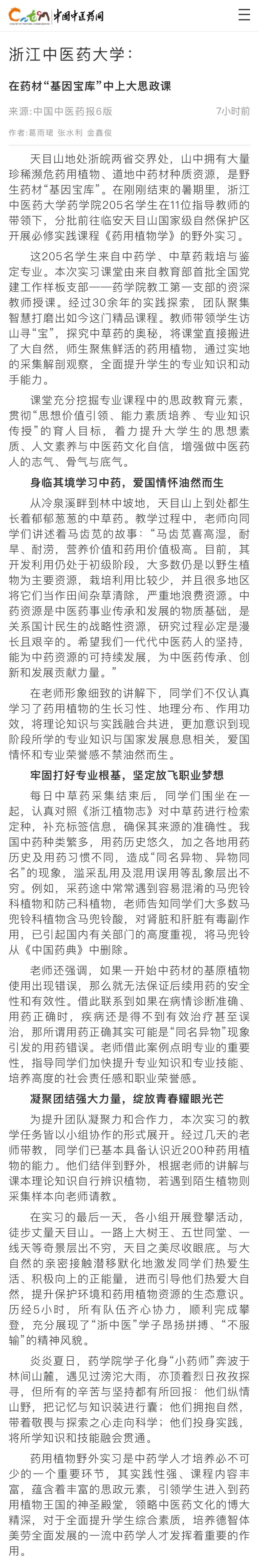 药用植物野外实习是中药学人才培养必不可少的一个重要环节,其实践性强、课程内容丰富,蕴含着丰富的思政元素,引领员工进入到药用植物王国的神圣殿堂,领略中医药文化的博大精深,对于全面提升员工综合素质,培养德智体美劳全面发展的一流中药学人才发挥着重要的作用。