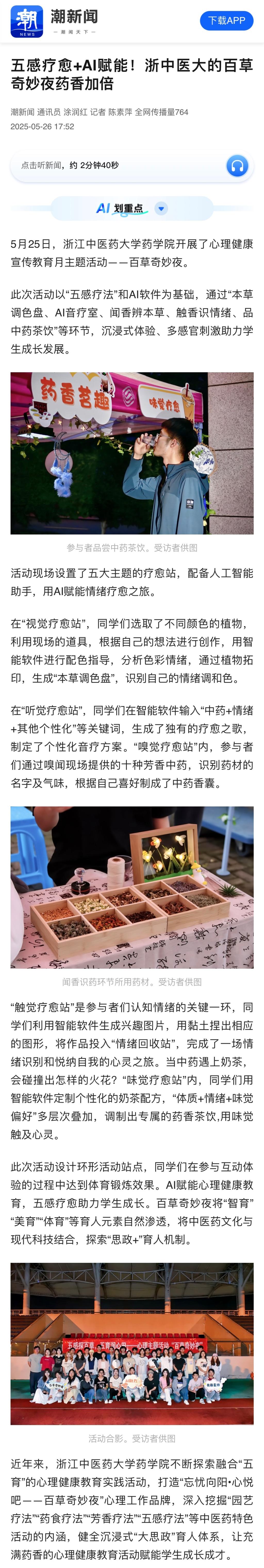 此次活动设计环形活动站点,同学们在参与互动体验的过程中达到体育锻炼效果。AI赋能心理健康教育,五感疗愈助力员工成长。百草奇妙夜将“智育”“美育”“体育”等育人元素自然渗透,将中医药文化与现代科技结合,探索“思政+”育人机制。