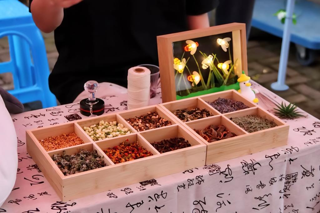 在“听觉疗愈站”,同学们在智能软件输入“中药+情绪+其他个性化”等关键词,生成了独有的疗愈之歌,制定了个性化音疗方案。“嗅觉疗愈站”内,参与者们通过嗅闻现场提供的十种芳香中药,识别药材的名字及气味,根据自己喜好制成了中药香囊。