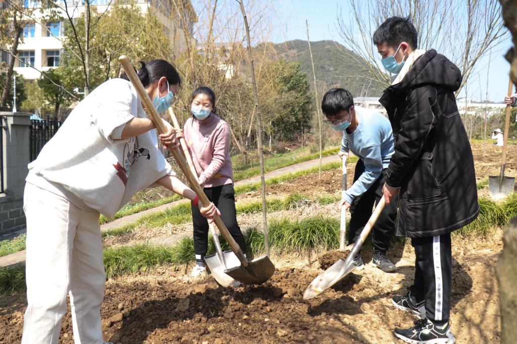 春意盎然的百草园中,师生们争先恐后地手拿铁铲、栽苗培土、提水浇灌......大家有说有笑忙的不亦乐乎,各个环节分工有序,正是一派干劲十足、热火朝天的景象。大家一丝不苟地种植手中的草药,将一颗颗充满生机和希望的树苗植入土里,不仅体验了亲自动手种植树木的乐趣,也体验了中药材栽培的过程,萌生了对中草药的热爱,增强了对中医药文化的自信!