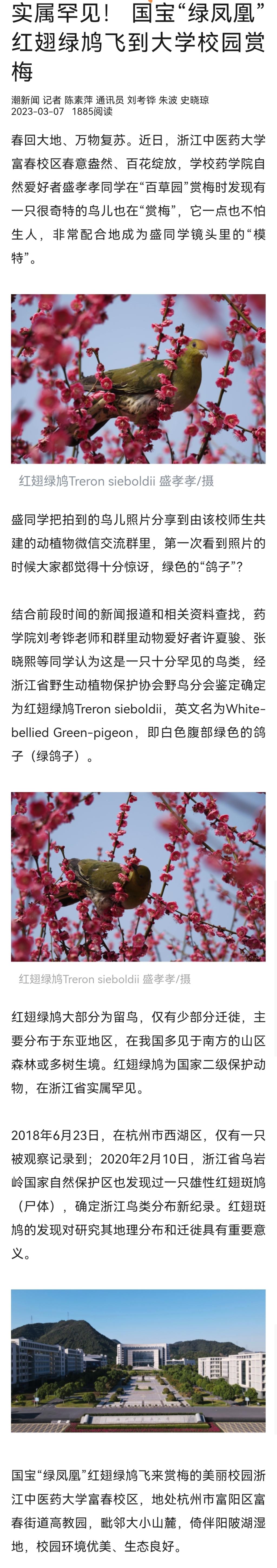 国宝“绿凤凰”红翅绿鸠飞来赏梅的美丽校园sunbet申搏富春校区,地处杭州市富阳区富春街道高教园,毗邻大小山麓,倚伴阳陂湖湿地,校园环境优美、生态良好。