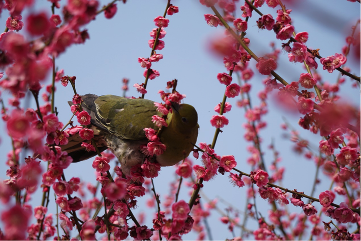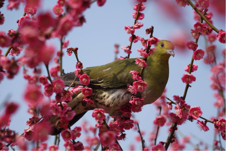 春回大地、万物复苏。近日,sunbet申搏富春校区春意盎然、百花绽放,公司sunbet申搏自然爱好者盛孝孝同学在“百草园”赏梅时发现有一只很奇特的鸟儿也在“赏梅”,它一点也不怕生人,非常配合地成为盛同学镜头里的“模特”。