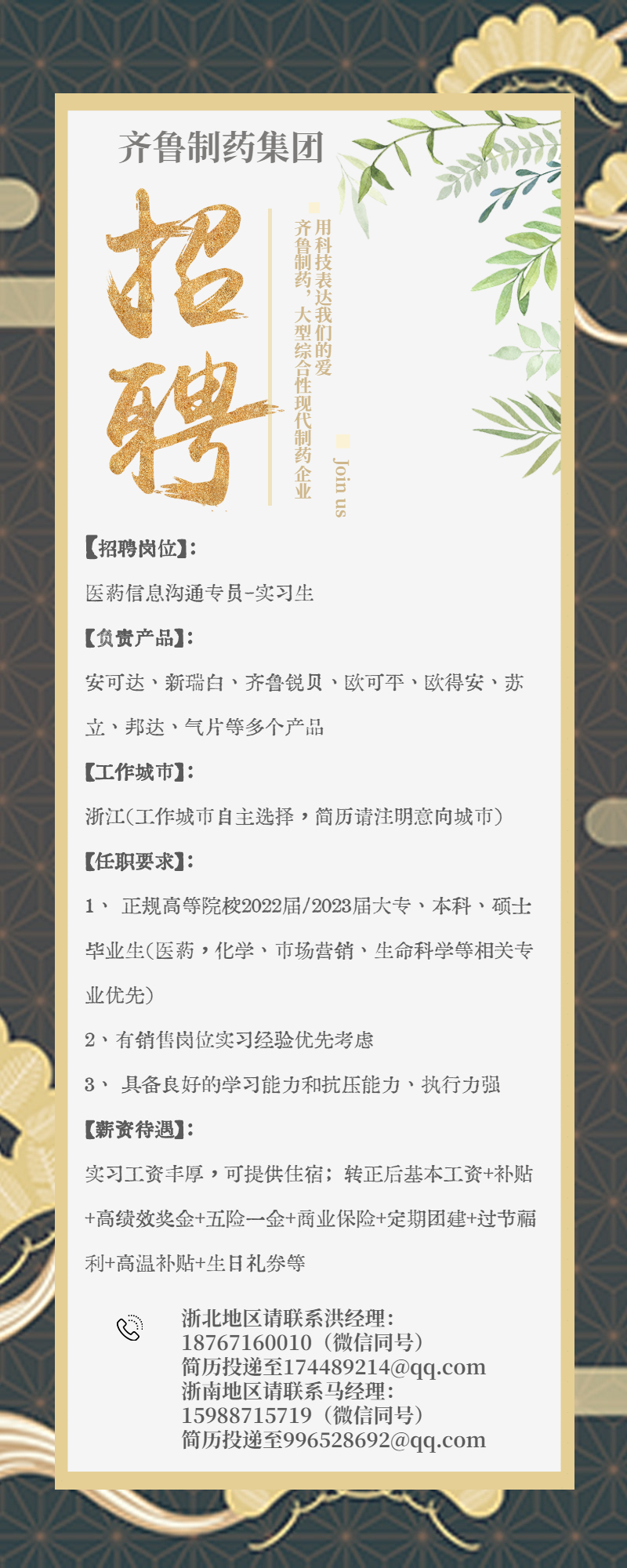 【2022届2023届均可】【招实习生+招聘】齐鲁制药-医药信息沟通专员-浙江地区