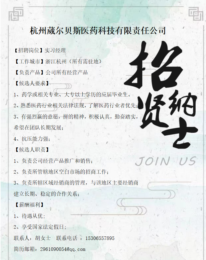 杭州葳尔贝斯医药科技有限公司招聘【员工招聘】