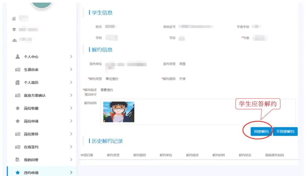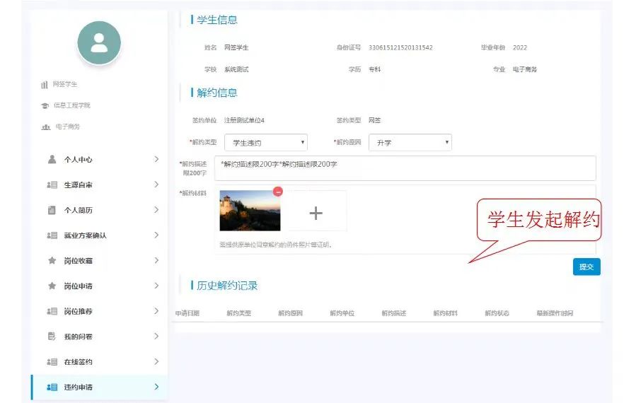 毕业生和用人单位均可发起解约申请。毕业生发起:登录网签平台,点击【违约申请】,如实填写相关信息后,点击【提交】发起解约申请。单位发起:登录网签平台,【签约管理】—【发起解约】。