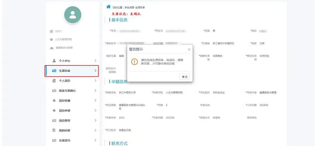 登陆后,进入【生源自审】,核对页面内的生源信息,确认无误,点击【确认】即完成生源自审。