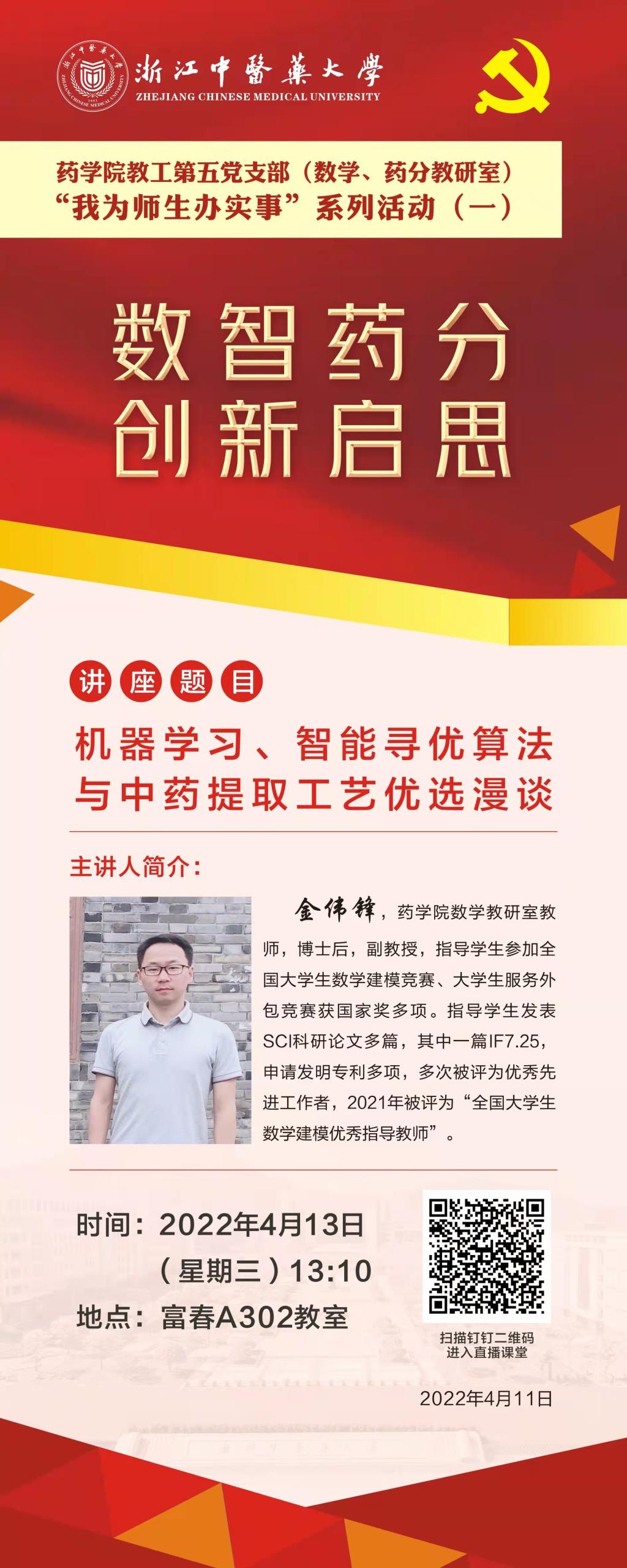 随着人工智能技术和理论的飞速发展,中医药与人工智能之间的学科交叉日益活跃。目前,在新医科建设内涵中明确鼓励医学与理科、工科等多学科交叉融通,及时将“互联网+健康医疗”、“人工智能+健康医疗”等医学领域最新知识、最新技术、最新方法更新到医学教学内容中,以期培养出符合新医科发展的创新复合人才。结合公司师生在应用相关模型和算法中遇到的常见问题和困惑,sunbet申搏教工第五党支部(数学教研室和药物分析教研室)将在4月开启以“数智药分,创新启思”为主题的系列活动,第一期以中药提取工艺优选为案例,深入浅出,助推中医药借助AI技术发挥重要作用。欢迎广大师生参加!