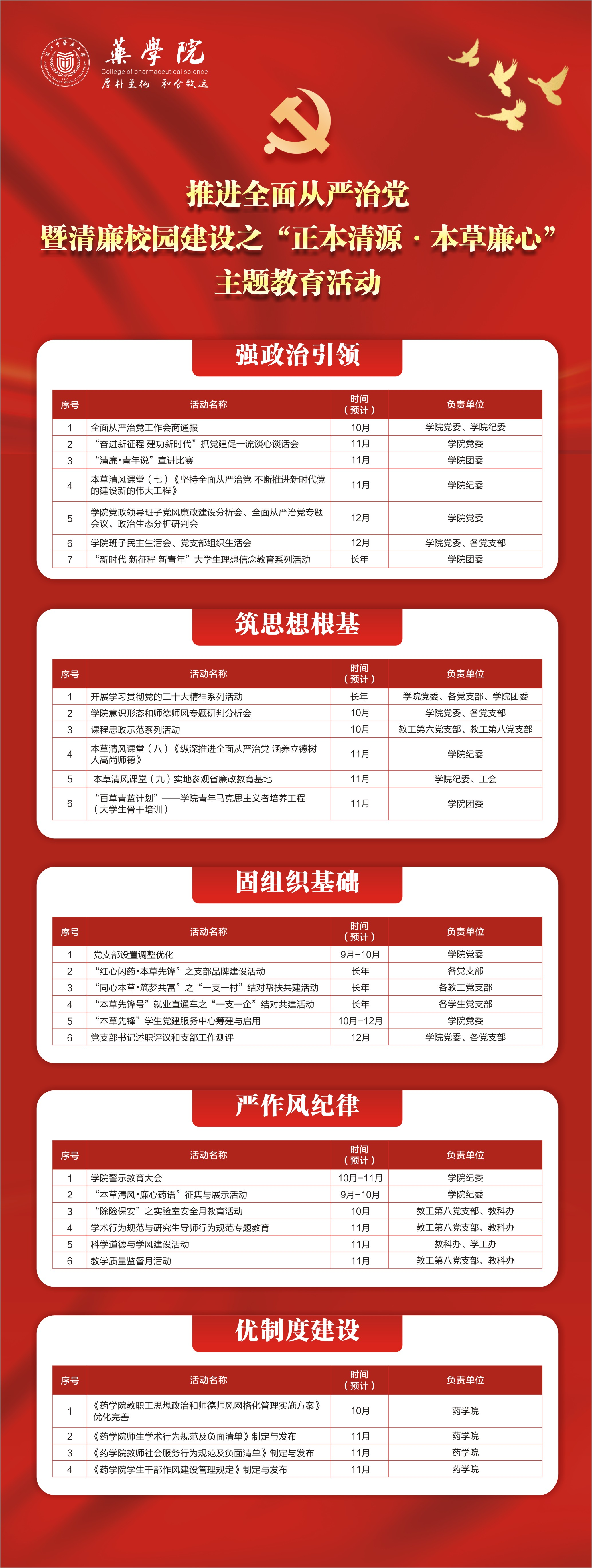 据悉,本次活动以“正本清源•本草廉心”为主题,分“强政治引领”、“筑思想根基”、“固组织基础”、“严作风纪律”、“优制度建设”五个板块,共计29项具体内容。通过教育活动引导全院师生积极弘扬自我革命精神,坚持严的主基调不动摇,自觉把全面从严治党各项规定任务要求融入人才培养、科学研究和社会服务,融入公司事业高质量发展的具体实践,落实到党的政治建设、思想建设、组织建设、作风建设、纪律建设、制度建设各个方面,努力以全面从严治党新成效护航一流中医药大学建设行稳致远。