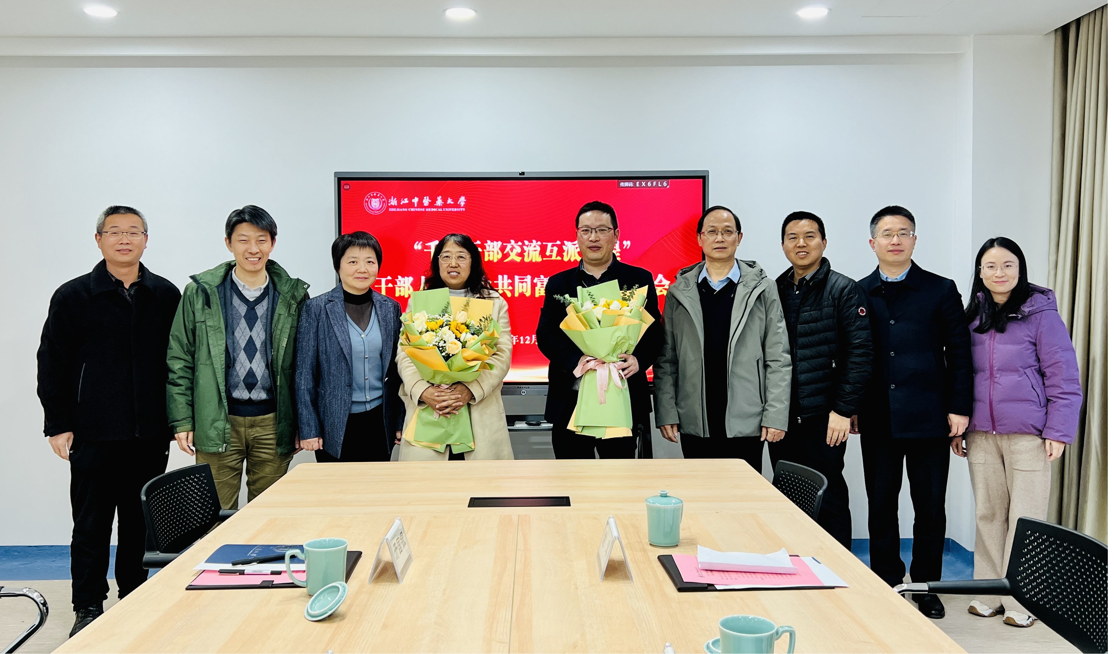 12月13日下午,省“千名干部交流互派工程”干部人才助力共同富裕行前欢送会在滨文校区行政楼三楼“统战之家”举行。公司党委副书记张元龙,公司党委委员、组织部部长黄爱军,药公司党委书记谢军,人事处副处长罗锋,科研部副部长开国银,派出挂职人员赵利梅、廖广辉及所在团队负责人等参加欢送会。会议由黄爱军主持。